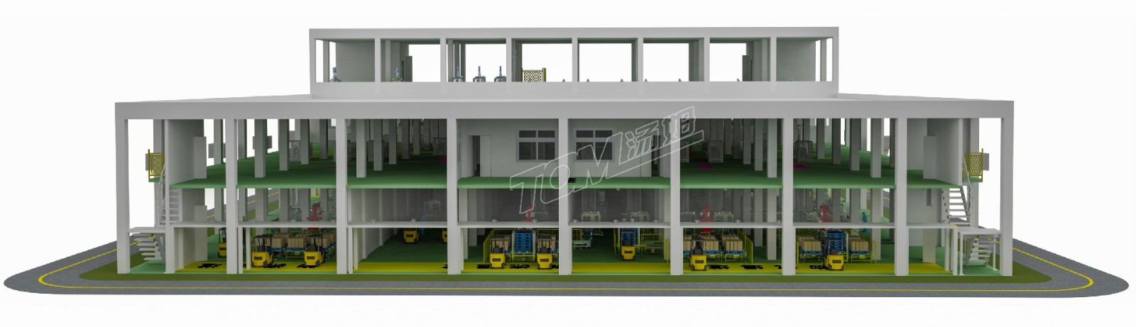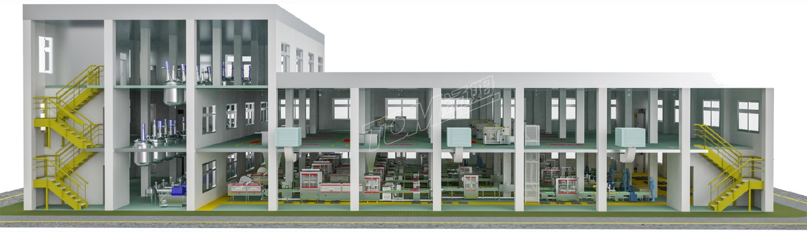 3、車間前道加工:局部三層。三層主要作為物料的暫存和投料區(qū)域,二層主要作為復(fù)配區(qū)域,一層為砂磨和過濾區(qū)域。本車間呈立體化設(shè)計(jì)布局及充分利用高低位差布置,有效提高了生產(chǎn)效率,減少能耗、車間用地。